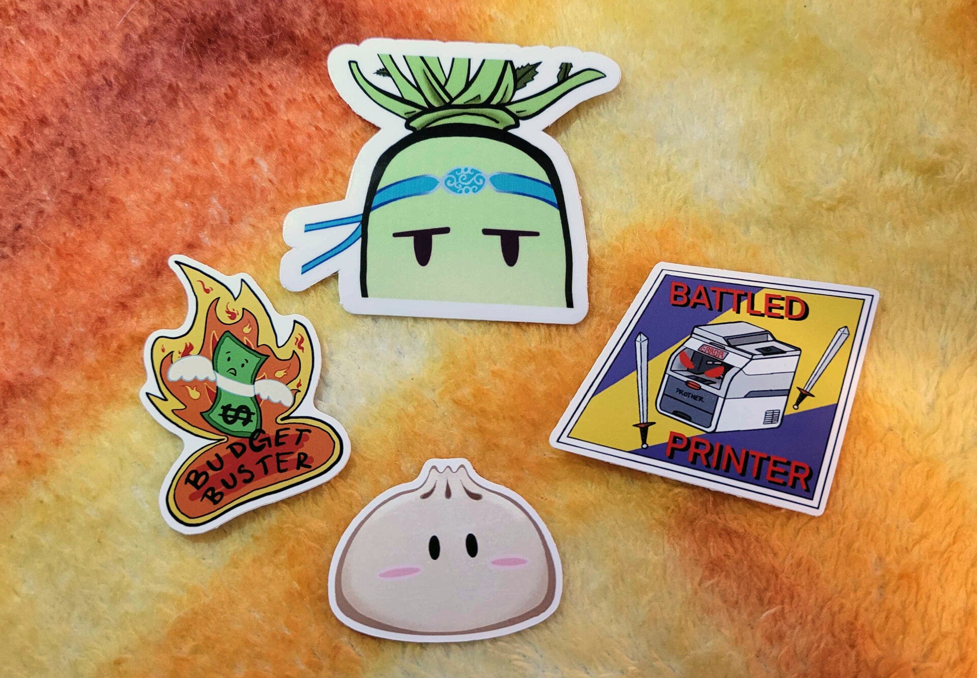 Tell me which stickers you want for the three pack: (Budget Buster, Battled Printer, Bao, or Unimpressed Daikon) please specify quantities if you want duplicates.